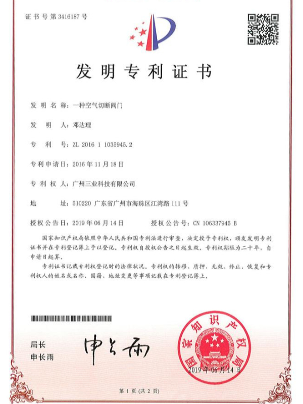 三业科技-- 一种空气切断阀门专利证书