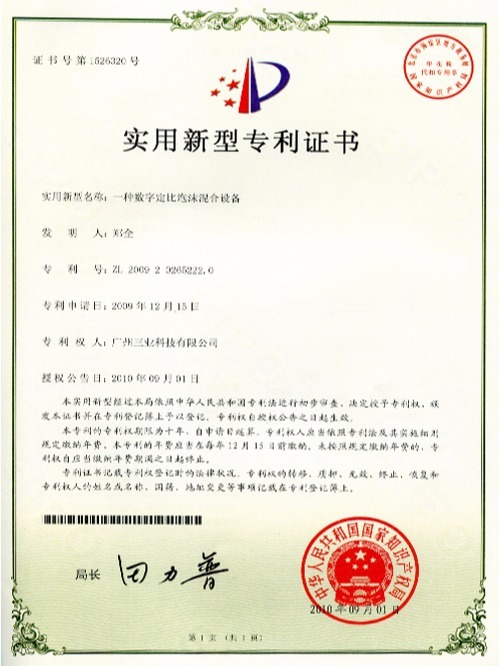 三业科技-数字定比泡沫混合装置专利证书