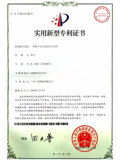 三业科技-数字定比泡沫混合系统专利证书
